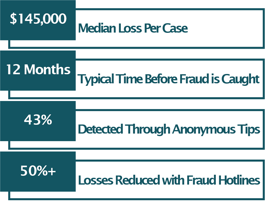 Infographic showing how to detect fraud in organizations, including statistics on median loss, detection time, tip reporting, and hotline effectiveness.
